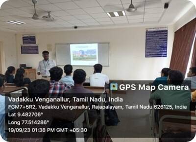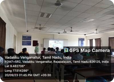 As a part of our college first year B.E./B.Tech. students (AI&DS A, B.Tech. IT) induction programme, a session on extra-curricular activities was scheduled and conducted on 19.09.2023 & 20.09.2023. The Session was handled by the coordinator of the RIT Photography Club. He briefed the students about the objective and scope of the club and listed the competitions and events organized by the student coordinators & team members of the club. The session was interactive. In order to give an overview of RIT Campus, documentary videos taken by the club members were shown to the students for motivating them. The documentary films are: 1. Ecosystem of RIT, 2. Marine Pollution awareness, 3.College documentary- Infra-structure & Lab Facilities 4. NSS, NCC, Sports activities, 5. Students Achievements Video Compilation, 6. The Student Kitchen - RIT Hostel Mess, 7. Short Films taken by our RIT Students.