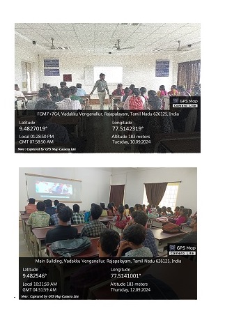 The event under SIP-8.1: Extracurricular Activities was conducted on 09.09.2024, 11.09.2024 & 12.09.2024 for the I Year B.Tech. IT, B.E. CSE, B.Tech, AI&DS students. The session was handled by the coordinator of the RIT Photography Club, who briefed the students about the objectives and scope of the club and listed the competitions and events organized by the student coordinators and team members. The session was highly interactive, and to provide an overview of the RIT Campus, documentary videos created by club members were showcased to inspire the students. The documentaries included Ecosystem of RIT, Marine Pollution Awareness, College Documentary - Infrastructure & Lab Facilities, The Student Kitchen - RIT Hostel Mess, and various short films taken by RIT students. The faculty in charge of the event was Dr. M. Venkatesh Perumal, ASP (Gr.III)/Chemistry.