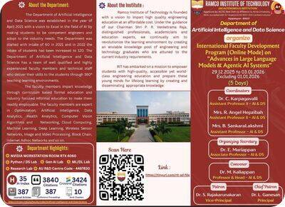The Department of Artificial Intelligence and Data Science, Ramco Institute of Technology, successfully organized an International Faculty Development Program (Online Mode) on Advances in Large Language Models & Agentic AI Systems from 29 December 2025 to 03 January 2026 (5 Days). The FDP aimed to provide faculty members, researchers, and professionals with in-depth knowledge of recent advancements in Large Language Models (LLMs) and Agentic AI Systems, covering both theoretical foundations and practical applications, while highlighting emerging trends, tools, and methodologies shaping the future of Artificial Intelligence. The sessions were delivered by eminent academicians and industry experts, offering valuable insights into cutting-edge research, real-world use cases, and future directions in AI. The program served as an effective platform for enhancing technical expertise, encouraging meaningful discussions, and fostering academic and research collaborations at the international level. The FDP was coordinated by Dr. C. Karpagavalli, Mrs. R. Angel Hepzibah, and Mrs. B. Sankara Lakshmi, with Dr. E. Mariappan as Organizing Secretary, Dr. M. Kaliappan as Convener, under the patronage of Dr. S. Rajakarunakaran, Vice-Principal, and Dr. L. Ganesan, Principal, and received overwhelming participation and positive feedback, reinforcing the departments commitment to continuous professional development and excellence in Artificial Intelligence and Data Science education and research.