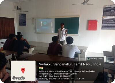 A Guest Lecture on Growth and Opportunities in the Core Electrical Industry was organized by the RIT Alumni Association on 28.01.2026 for third-year EEE students. The resource person, Mr. T. R. Alagarsamy Yasvanth (2021 batch), Graduate Engineer Trainee, Foster Energy, Chennai highlighted the awareness about growth and scope of the core electrical industry and gave motivation to pursue core engineering roles. The overall feedback from the students was highly positive, with many expressing interest in attending more such sessions in the future. The event was successfully coordinated by Mr. Sandeep Ram, third-year EEE students, under the guidance of Dr. A. S. Vigneshwar, Assistant Professor (III)/EEE, Faculty Coordinator.