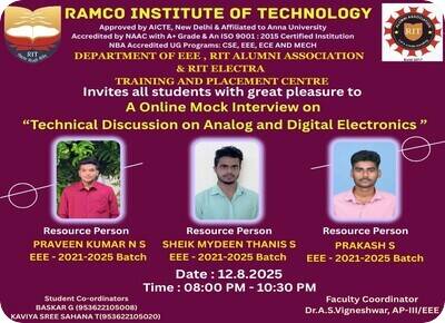 A Mock Interview on Technical Discussion on Analog and Digital Electronics was organized by the RIT Alumni Association on 12.08.2025 for final-year EEE students. The resource persons, Mr. N. S. Praveenkumar, Mr. S. Prakash & Mr. S. Sheik Mydeen Thanis (2025 batch) Silicon Validation Engineer, Tessolve, Bangalore asked several questions related to circuit analysis, electronic devices, digital electronics, and linear integrated circuits. They also requested our students to explain a variety of circuits simulated using software. The overall feedback from the students was highly positive, with many expressing interest in attending more such sessions in the future. The event was successfully coordinated by Mr. G. Baskar and Ms. T. Kaviya Sree Sahana, final-year EEE students, under the guidance of Dr. A. S. Vigneshwar, Assistant Professor (III)/EEE, Faculty Coordinator.
