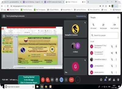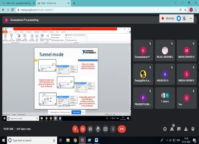 The Department of ECE in association with RIT Electronica and NI LabVIEW Academy organized one day workshop LabVIEW Fundamentals on 25.01.2022 from 9.30 AM to 4.00 PM through Google Meet. Totally 19 students from second and third year ECE participated in this workshop. The resource person for this workshop was Mr.P.Gunasekaran, AP/ECE, Ramco Institute of Technology, Rajapalayam. During the workshop students were trained on LabVIEW fundamental concepts. The workshop was organized by Dr.A.Azhagu Jaisudhan Pazhani, ASP/ECE and Mr.P.Gunasekaran, AP/ECE. The students actively participated in the webinar by asking various doubts. Student coordinators Ms.C.Indhumathi, III ECE A and Ms.R.Monika, III ECE B gave a welcome address and vote of thanks. Finally, students feedback is collected.