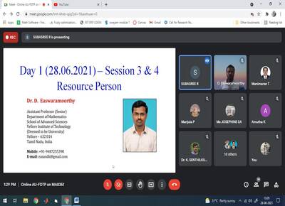 Department of Mathematics conducted Anna University sponsored Online Six-Day FDTP on MA8351-Discrete Mathematics" during 28 June - 03 July, 2021for the faculty members of Anna University affiliated Colleges. The Resource Persons are Dr.Durga Prasad Challa, IIT, Tirupati, Dr.M.Rajesh Kannan, IIT, Kharagpur, Dr.D.Easwaramoorthy, VIT, Vellore, Dr.S.Kalyani, Kamaraj College of Engineering and Technology, Virudhunagar. 55 external and 5 internal participants actively participated in the FDTP. Dr.K.Basari Kodi & Dr.T.Manimaran coordinated the program.