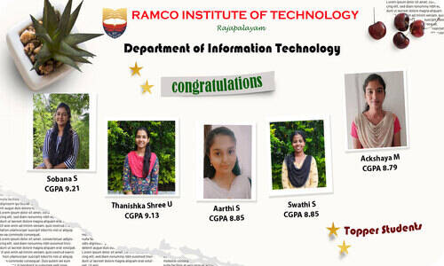 Department of Information Technology, list of topper students from II Year are Ms. Shobana. S (9.21 CGPA), Ms. Thanishka Shree. U (9.13 CGPA), Ms. Aarthi. S (8.95 CGPA), Ms. Swathi. S (8.85 CGPA) and Ms. Ackshaya. M (8.79 CGPA).