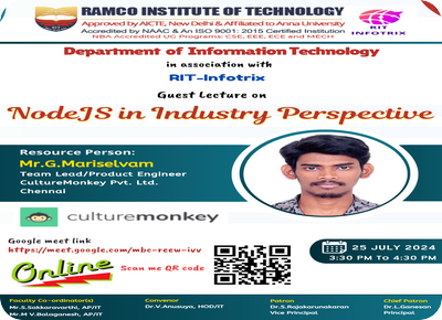 A guest lecture was organized by the Department of Information Technology in association with RIT InfoTrix on 25th July 2024 in virtual mode for B.Tech IT II year students. It was specially organized to inculcate knowledge among the students regarding Node.js in industry perspective. The entire B.Tech - IT II Yr class of 58 students actively participated in this event. Second Year Student Mr.M.Joel Paulraj delivered the welcome address.The lecture was delivered by highly qualified and experienced Industry Person Mr.G. Mariselvam, Team Lead, Culture Monkey Pvt Ltd Chennai. The resource person interacted with the students and shared his experiences. He explained the concept of Node.js in modern web application development. He taught about overview of Full Stack Development, Front End Development, Back End Development, MEAN Stack and MERN Stack. He also taught about the various back-end development tools such as Java, C#, Python and Ruby. He explained about DevOps. The session was enlightening as it proved to be very fruitful and beneficial for all the students. Student Ms.S.Sobana given the vote of thanks. The workshop was coordinated by Mr.S.Sakkaravarthi,AP/IT and Mr.M.V.Balaganesh,AP/IT under the guidance of Dr.V.Anusuya, HOD/IT.