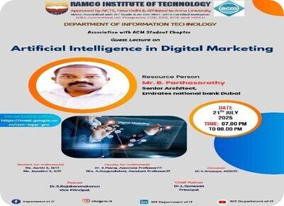 The Department of Information Technology, in association with ACM Student Chapter jointly organized an Online Guest Lecture on Artificial Intelligence in Digital Marketing on 21.07.2025 for ACM Student members from III yr and II Year IT. The Resource person of the guest lecture was Mr. B. Parthasarathy, Senior Architect, Emirates National Bank Dubai. Around 55 students were actively participated in this guest lecturer. The resource person gave an evolving role of AI in the marketing domain. It will cover key concepts such as AI-driven customer segmentation, personalized recommendations, predictive analytics, chatbots, and content automation. The session will help students and professionals understand how AI technologies are reshaping digital marketing practices, making them more efficient, data-driven, and customer-centric. The guest lecture was successfully organized and accomplished by the ACM student coordinators Ms. S. Aarthy III IT, Ms. S. Jeyadevi II IT. Ms. S. Arthy delivered the welcome address and Introduced the Chief Guest and at the end of the session, Ms.S. Jeyadevi gave vote of thanks. This seminar was organized by Dr. K. Palraj ASP/IT and Mrs A. Alagulakshmi AP / IT, under the guidance of Dr. V. Anusuya, HOD/IT.