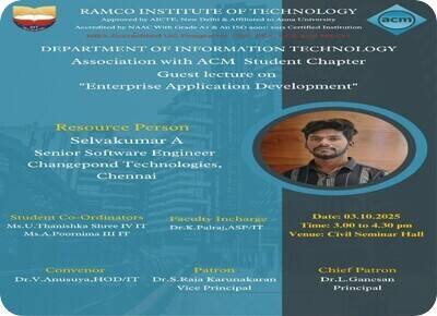 The Department of Information Technology, in association with ACM Student Chapter jointly organized an Guest Lecture on Enterprise Application Development on 03.10.2025 for ACM Student members from III yr and II Year IT at Civil Seminar Hall. The Resource person of the guest lecture was Mr. A. Selvakumar, Senior Software Engineer, Changepond Technologies, Chennai. Around 65 students were actively participated in this guest lecturer. He discussed various aspects of enterprise application development, including real-time case studies, tools, and technologies used in the industry. Adoption of Spring Boot for rapid enterprise application development, focusing on its features like embedded servers, auto-configuration, and simplified dependency management. The students expressed that the lecture was highly informative and enhanced their knowledge of advanced software engineering concepts. The guest lecture was successfully organized and accomplished by the ACM student coordinators Thanishka Shree U, IV Year IT and Poornima A III Year IT. Ms. Pooja Shree S delivered the welcome address and Murugalakshmi V Introduced the Chief Guest and at the end of the session, Surulivelan M gave vote of thanks. This seminar was organized by Dr. K. Palraj ASP/IT and Mrs G.Sivasathiya AP / IT , under the guidance of Dr. V. Anusuya, HOD/IT.