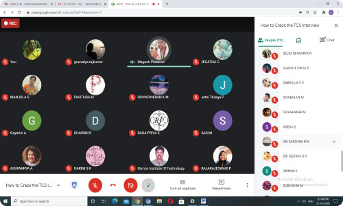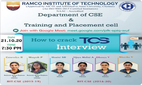 Ramco Institute of Technology, Department of Computer Science and Engineering in association with Training and Placement cell and CSI student chapter organized a company-specific talk on the title How to crack TCS interview on 21.10.2020 from 7.30 PM to 09 .00 PM. 100 participants from CSE Department participated in the session. The resource persons were TCS placed students Ms. Gowsalaya and Ms. Magnesh Assistant Systems Engineer Tata Constancy Services (TCS) of 2015 batch and Ms. Harini S.R, Vijaya Malini, Ms. Dhanaya V and Ms. Nivetha V of 2016 batch discussed the question pattern in TCS test and also suggestion tricks to clear the interview They also shared their experience of writing TCS test. Talk was very interactive and students felt the talk was very informative and useful.