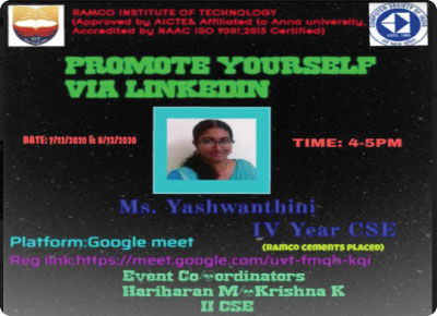 The Department of Computer Science and Engineering in association with CSI student chapter organized Promote yourself via Linkedin on 17-18 Dec 2020. The resource person Ms.Yeshwanthini of the final year explained the procedure for creating an account and also discussed the benefit of having a LinkedIn account. Talk was very interactive and students felt the talk was very informative and useful.