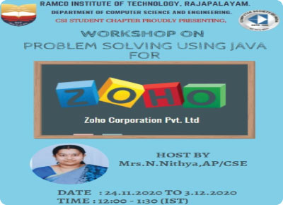 The Department of CSE in association with CSI student Chapter is organized workshop on "Problem solving using Java for III year and IV year CSE students starting from 24.11.2020 to 03.12.2020. Created a hacker rank contest and posted with challenges. The students actively solved the problems in the contest regularly and were able to develop the coding skills.