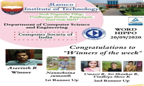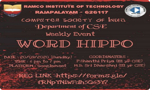 Word Hippo event was organized by the RIT-Computer Society of India on 20.09.2020 through the Google platform The event was organized by P.Shanthi Priya and Sri Dharshni of III CSE. More than 40 students participated in the events. R, Aravinth III CSE winner, Nanneboina Sumanth First Runner up and R Umasri, R. Sri Shankar and K Vindhiya Shree are the second Runner up . Participates enthusiastically participated in the event and an E certificate was given to all the participates and winners.