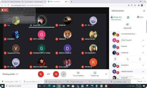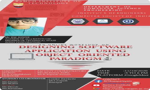 Dept. of CSE in association with CSI Student Chapter organized an online workshop on Designing Software Application using object-oriented Paradigmfor II and III CSE students on 11.10.2020. Mr.K.M Eswer Alumni of the 2014 batch and member of the Technical staff of Zoho corporation has presented tips for designing software and the importance of Object-oriented programming in the software. The students actively participated and learned about the use of the object-oriented concept. Ms.M.Harini and Mr. M. Dinesh Kumar of II CSE and Ms. P.Shalini, and S.Kavimalar of III CSE are the coordinators of the event.