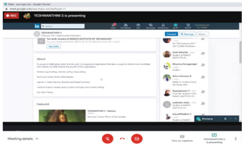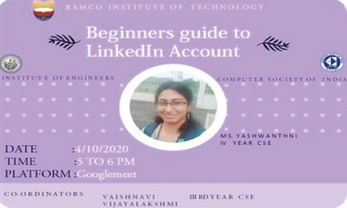 The Department of CSE in association with CSI and IE (I) Student Chapter organized a webinar on Beginners guide to LinkedIn Account for II year and III year CSE students on 04.10.2020. Ms.S.Yeshwanthni, IV CSE has presented tips and guides to open and organize a LinkedIn account. The students actively participated and learned about the use of the LinkedIn account. Ms.A.Vaishnavi, III CSE, and Ms.S.Vijayalakshmi, III CSE are the coordinators of the event.