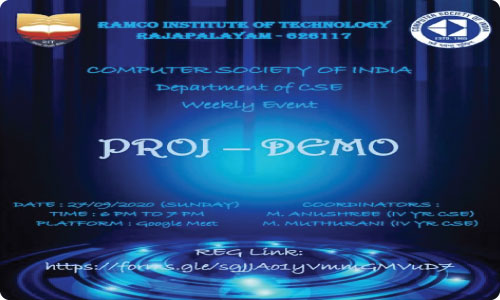Project Demo event was organized by the RIT-Computer Society of India on 27.09.2020 through Google Meet. The event was organized by Ms.Anushree and Ms.M.Muthurani of IV CSE. The Winner Mr. Nanneboina Sumanth of CSE explained his working on the project and also shown the demo. Mrs. B. Vijayalakshmi AP(SG)/CSE evaluated the project and express the event was very informative.