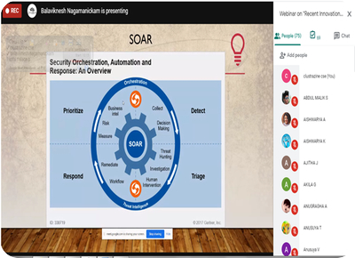 Ramco Institute of Technology, Department of Computer Science and Engineering in association with CSI and ISTE students chapter organized Technical Webinar on Recent Innovations in IT Industry on 25.07.2020. 82 participants attended this session. The resource person, Mr.Bala Viknesh Nagamanickam, Release Quality Assurance Engineer, Fortinet, Vancouver, Canada discussed about various new innovations such as Software Defined Network (SDN), Security Orchestration, Automation and Response (SOAR), Machine Learning, IBM Watson and Block Chain. He also shared about the 6th Sense: Pranav Mystery. He also discussed about the higher education in foreign universities and job opportunity in Cyber security domain.