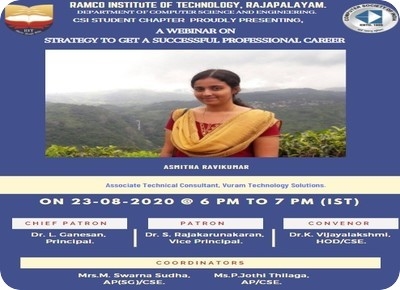 The Department of Computer Science and Engineering, Ramco Institute of Technology organized Virtual Webinar on Strategy to get a Successful Professional Career in association CSI Students Chapter on 23rd August 2020 from 06.00 PM to 07:00 PM. The resource person Asmitha RaviKumar, Associate Technical Consultant, Vuram Technology Solution, Alumni (2014 Batch) discussed the methods and tricks to get success in professional career and also shared how to prepare for the software company interviews and significance of doing online courses. Also, she discussed the benefits of doing Mini projects and advice the students to actively participate in all the events organized by the Department and encouraged the students to organize the events to develop the leadership Quality. 100 participants from various Departments participated actively through Google meet. The participants expressed that the webinar was highly enlightening and useful. The Webinar was coordinated by Mrs.M.Swarna Sudha AP(SG)/CSE and Ms.P.Jothi Thilaga, AP/CSE.
