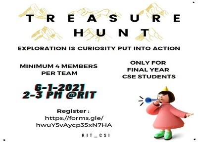 The Department of CSE in association with the Computer Society of India conducted the event Treasure Hunt for the final year CSE students.Ms P. Rajarajeswari, Mr.K.Sathya Prakash, and Ms.S.Yeshwanthini students of the final CSE conducted the event. Treasure map clues were given to the participants and they were asked to track the route and find the treasure. Participants found the game interesting Totally 7 teams participated with 4 participants in each team. Finally, one team Mr.Yogesh Loganath, Mr.Sukin Mr.M, Guru Anand G, and Mr.Sriram Karthikeyan were winners. Students participated enthusiastically.