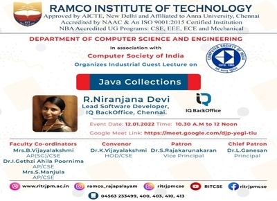 Department of Computer Science and Engineering in association with CSI organized an Industrial Guest Lecture on Java Collections for III Year ECE, EEE & CSE students and II Year CSE students on 12.01.2022 at 10.30 am. The resource person of the program is Mrs.R.Niranjana Devi, Lead Software Developer, IQBackOffice, Chennai. She started the session with the introduction of collection frameworks in Java. She explained the importance and need of collections and the collections Hierarchy. She discussed the list interface such as ArrayList, LinkedList, Vector and Stack. She described the set interface such as Hash set, LinkedHash Set, Tree Set and map interface. Finally she concluded the session with the places where different collections can be used for solving real world problems. The guest lecture was coordinated by Mrs.B.Vijayalakshmi,AP(SG)/CSE, Dr.I.Gethzi Ahila Poornima, AP/CSE and Mrs.S.Manjula, AP/CSE under the guidance of Dr.K.Vijayalakshmi, Prof. & Head/CSE.