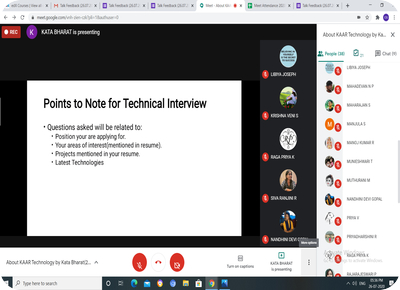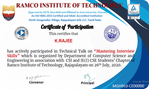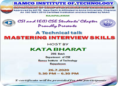 The Department of Computer Science and Engineering, Ramco Institute of Technology organized a Virtual Technical talk on Mastering Interview skills in association CSI Students Chapter and Institute of Engineers (IE) student chapter on 26th July 2020 from 05.30 AM to 06:30 PM. The resource person Kata Bharat student of 2016 Batch discussed the about the interview and Resume preparation and also shared how to deliver the self-introduction and significance of SAP, aptitude questions, online Practice geeksforgeeks.com, hacker rank, Codechef, w3schools.com. Also, he discussed the benefits of doing the Mini project. 100 participants from various Departments participated actively through Google meet. The participants expressed that the talk was highly informative and useful.