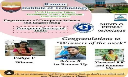 MIND O PEDIA event was organized by the RIT-Computer Society of India on 05.09.2020 through the Quizizz platform The event was organized by Ms. M. Karthiga Ms.V., Vishnu Praba, and Ms. R. Dharsni of III CSE. More than 60 students participated in the events. CSE enthusiastically participated in the event and the final winners are V. Vidhya II CSE, R. Sriram III CSE R.K Yuvasri II CSE.