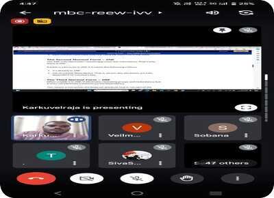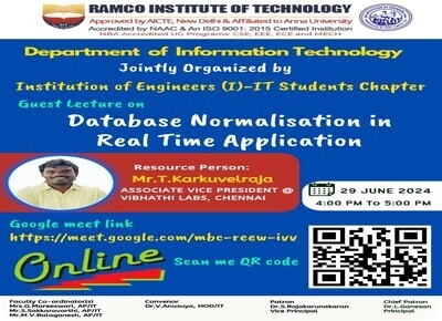 The Department of Information Technology, in association with RIT-Institution of Engineers (India), organized a Guest Lecture on Database Normalisation in Realtime Application in online on 29.06.2024. It was specially organized to inculcate knowledge among the students regarding Database Normalisation in Real Time Application. The entire B.Tech - IT II Yr class of 58 students actively participated in this event..The lecture was delivered by highly qualified and experienced Industry Person Mr.T. Karkuvelraja, Associate Vice President, Vibhathi Labs, Chennai. He explained the concept of Normalization, its various forms along with its relationship with the Real World Entities. Then he taught how to solve its different forms by quoting a practical example. The session was enlightening as it proved to be very fruitful and beneficial for all the students. This event was organized by Mr. S. Sakkaravarhi, AP/IT , Mrs. G. Mareeswari, AP/IT and Mr. M.V. Balaganesh, AP/IT under the guidance of Dr. V. Anusuya, Associate Professor & Head/IT.