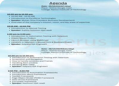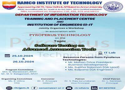 The Department of Information Technology, in association with Training and Placement centre and RIT-Institution of Engineers (India), jointly organized a Workshop on Software Testing and Advanced Automation Tools on 25.10.2024 and 26.10.2024. The event was coordinated by Ms. Ackshaya M, Mr. Prasath J, Ms. Sobika Joleen G.J and Mr. Alagu Surya.S of III-year & II -year IT students. The workshop was designed specifically for third-year IT students, providing a comprehensive learning experience focused on software testing and advanced automation tools. The resource persons are from Pyroferus Technologies Mr. Mohan (VP Business Development), Ms. Sujitha Solomon (QA lead) and Ms. Kalpana (QA Engineer). Participants were introduced to key themes relevant to modern software development and testing practices across various engineering domains. This session aimed to equip students with foundational knowledge in software testing methodologies, enhance their technical skills in using automation tools. This event was organized by Ms.K.Uthra/TPO and the Program committee members Mrs. G. Mareeswari AP/IT, Mr. M.V. Balaganesh AP/IT under the guidance of Dr. V. Anusuya, Associate Professor & Head/IT. The students gave very good feedback about the event.